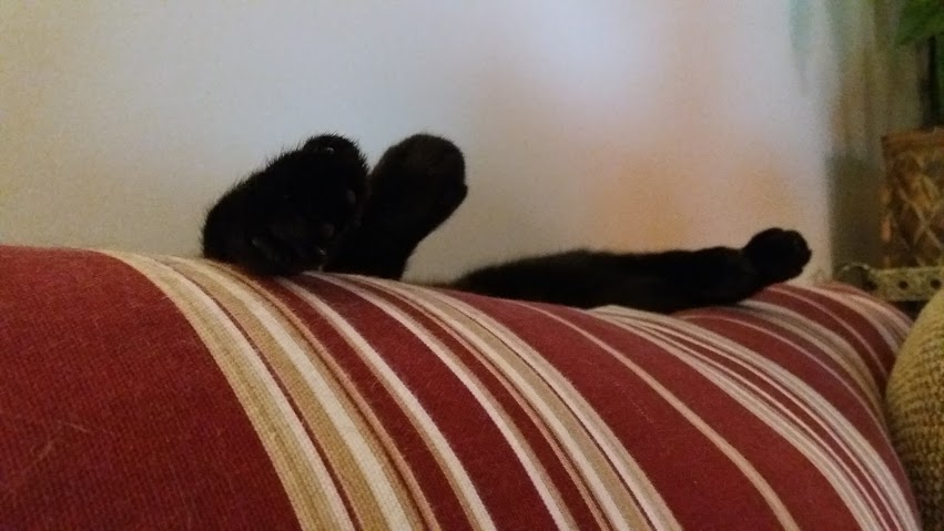 Lately, every evening, Clover has been wedging himself between the back of the couch and the wall, to hang out with us.