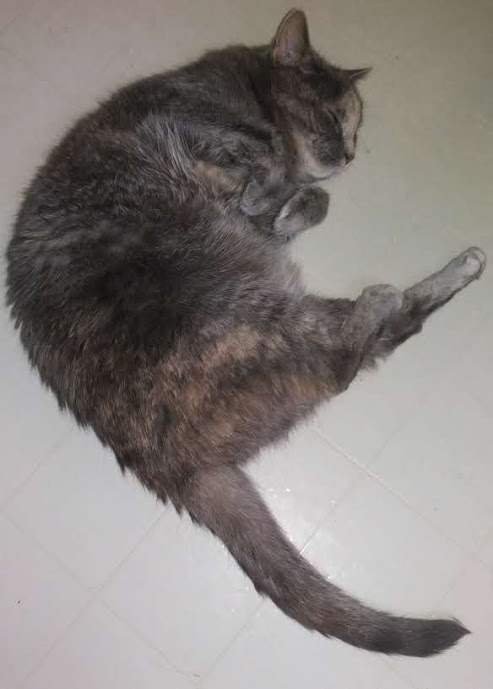 It is still so darn hot, so Miss Kitty chose the kitchen floor to get some relief, there's also a small fan blowing on her.