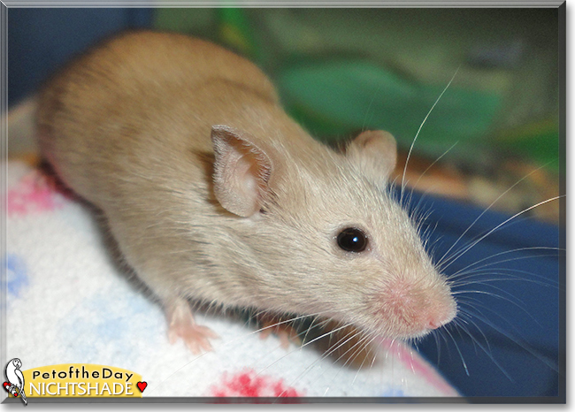 Congratulations, Nightshade, on being POTD! We :love: mice! You are precious, beautiful and adorable! :) We're so happy that you have found a loving forever home! Sending love and best wishes to you and all your wee friends for long, happy, healthy, fun, safe lives, Sweetie! :love: http://www.guineapigsrfun.net/275827561 http://www.guineapigsrfun.net/275827547 P.S. Please opt to adopt mice (and all rodents) from the Humane Society and other shelters!