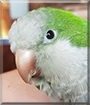 Dearest Crona, you are adorable! What a beautiful, spunky Quaker Parrot you are. Your green and white feathers are stunning, and your personality shines through in that sweet face. You look like you're smiling in those great photos, and maybe you are! What a story you have to tell.. You came to your dear person after your mate had been sold away from you and you'd plucked out your feathers. Thankfully, you and she made an immediate connection, and now most of your feathers have grown back. You have lots of energy and are full of mischief, and you make your dear person smile with your antics. You and she love each other very much, don't you. What a delightful love-filled home you share!