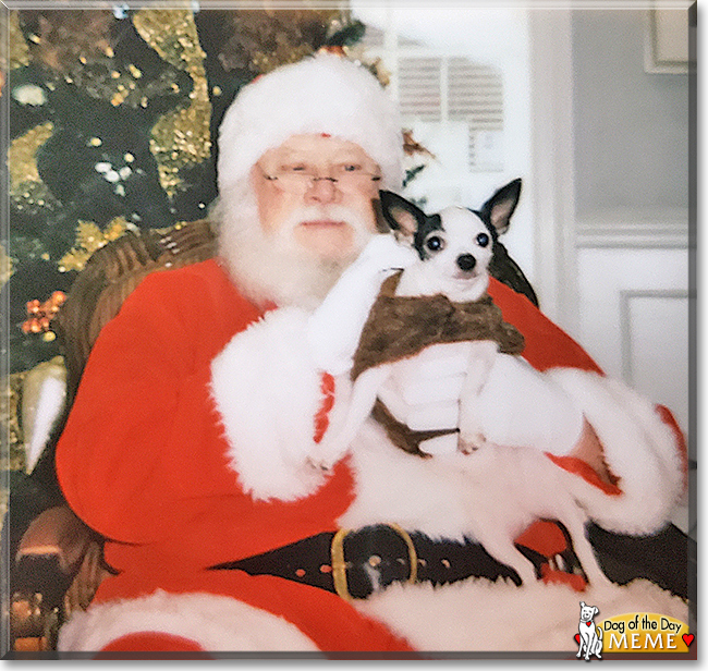Dearest Meme, you are adorable! What a sweet little Chihuahua you are, all decked out for Christmas, visiting Santa Claus with your dear person. You are a precious rescue girl and have the most delightful personality, very sweet and shy. You and your dear people all love each very much, don't you. What a wonderful love-filled home you share!