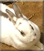 Dearest Olaf, what a beautiful American-mix Rabbit you are! You're so pretty with that soft-looking white and grey fur and that sweet face with those lovely big eyes. And what a story you have to tell! You first belonged to a child who thought she wanted a rabbit but soon got tired of you. There's an excellent example indeed of why young children should not have rabbits as pets. We're so glad you're with your true home and family now! You love to flop and binky and eat. You also love attention, more from your girl bun pal Cadbury than from humans.