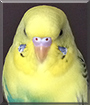 Dearest Twigs, what a beautiful budgie you are! Those colorful feathers are absolutely gorgeous, and you have the sweetest face with those big dark eyes! And what a wonderful story you have to tell! Your dear mom-to-be saw you in the store one day. She'd never had a budgie before but was mesmerized by your stunning colors. She and dad-to-be came back later and got you and the mostly-white budgie Pix. You two became best friends, but we're sorry to learn Pix passed away after a year. Now you live in a room with several parrots! You come out for supervised playtime with them each evening. You are such a good boy, and you and your dear parents all love each other very much, don't you. What a delightful love-filled home you share!