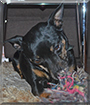 Dearest Dina, what a beautiful Miniature Pinscher you are! You have sleek, pretty black and brown fur and the sweetest face with those lovely big eyes. Your dear young friend feeds you every day, and you play together after she/he gets home from school. You love your rope toy, so much that you destroyed the old one and your people had to buy you another. You and your dear young friend love each other very much, don't you. What a wonderful love-filled home you share!