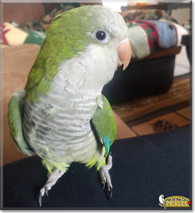Dearest Pickles, you are utterly adorable! What a sweet, beautiful Quaker Parrot you are, and how lovely to see you cuddling up with your dear mom and sister! You bring great joy and strength to them as they contend with health issues. You have the most delightful personality. How nice that you have so many bird friends to hang out and chat with!