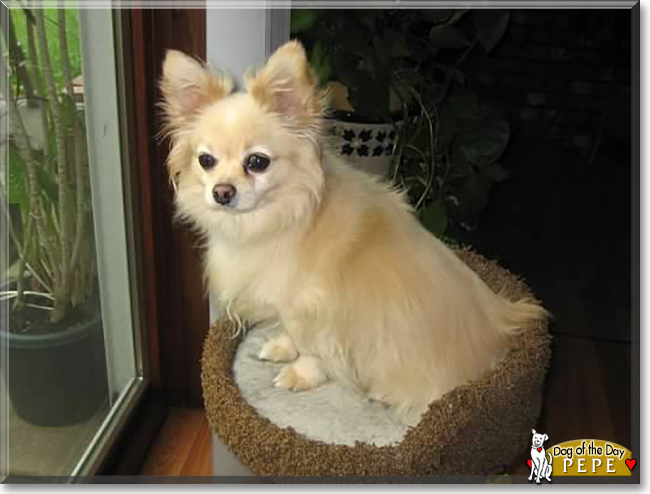 Dearest Pepe Angel, what a beautiful Chihuahua you are, and what a wonderful story you have to tell. You were adopted as a puppy from a local rescue not long after your family had lost their beloved poodle Bud. You were a surprise and a joy for them, love at first sight! Five years later Sam the kitty joined the family, and you two became best buddies. You and they were all together until you joined Bud Angel at the Rainbow Bridge last April. Your dear family members miss you very much! We hope your choice as today's Dog of the Day will help to bring them some comfort as you are celebrated the world around. You and they all love each other very much, don't you. What a wonderful love-filled home you have shared and always will!