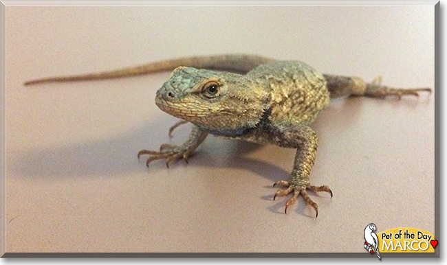 Dearest Marco, what a beautiful Western Fence Lizard you are, and what a wonderful Coat of Many Colors you have! You also have the most delightful, special personality, with the ability to make friends and to help your dear person be less anxious. You're calm and sweet and like to be petted around your ear and sides. You are a very modern lizard and love to watch 'Slither.io' and cat videos! How thoughtful and responsible of your dear person for choosing a local pet; in case you should ever get loose (never, we hope!), you could make it on your own okay and not hurt the environment. You and he/she love each other dearly, don't you. What a wonderful love-filled home you share!