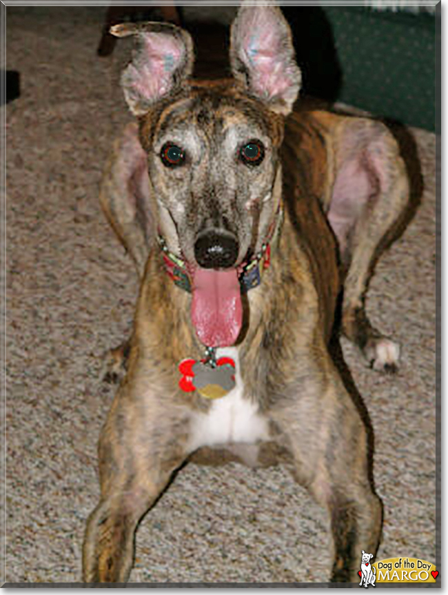 Dearest Margo, you are absolutely adorable! What a beautiful Greyhound you are, and what a great smile you have there! You look like the happiest dog in the world (and maybe you are!). You have the most delightful personality, too. You are full of energy and make your dear people smile with your antics. We're so glad you have retired from the world of greyhound racing, and we are so glad about and grateful to your people for adopting you and adopting your brother Monty too. And how good that you volunteer at the hospital! You make so many people happy when you visit them there. You're very affectionate, and you and your family members all love each other very much, don't you. What a wonderful love-filled home you all share!