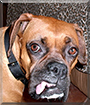 Dearest Tilly, you are absolutely adorable! You are the most precious Boxer lady, with the sweetest face with that special look of love. I agree with everyone else that your "condition" adds to your charm, which is already considerable. What a delightful personality you have! You're very sweet and loving, and you 'lean' on people. You have your own blanket, on your parents' bed! You love going on car rides and trotting alongside scooter rides.