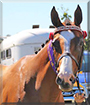 Dearest Kobi, a.k.a. Happy Hour, you are stunning, indeed! What a beautiful Thoroughbred you are with that sleek glossy brown and white coat and the black mane and tail, and that sweet face with the white blaze and those lovely big dark eyes. You have the most delightful personality, and you are quite the champion! Thank you for sharing those great photos with us. It's so nice to see you with your proud young lady there. You two make a great team! You and she love each other very much, don't you. What a wonderful love-filled home you share!