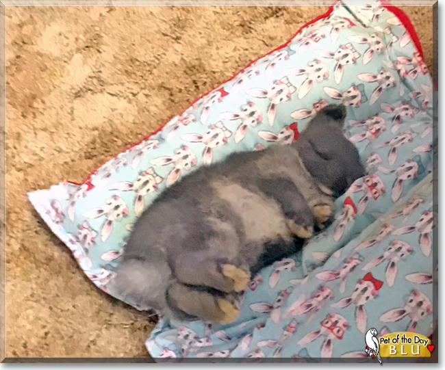 Dearest Blu, what an adorable blue bunny you are! That grey fur looks so soft, and what a sweet face you have with those little perky ears and white whiskers and lovely dark eyes. That baby picture of you snoozing on the rabbit blanket is beyond adorable! You are a young child, a growing girl, and a true champion, winning the blue ribbon in the one show you entered!