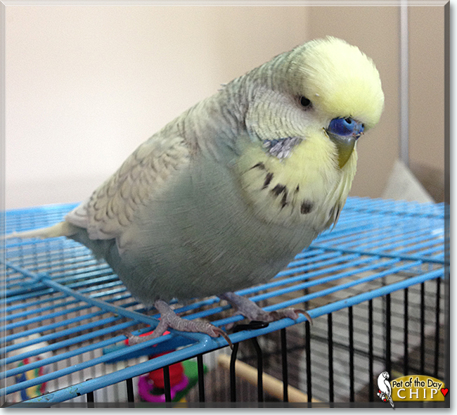 Dearest Chip, you are adorable! What a beautiful Budgie boy you are! You don't even realize you're a bird, and you live with your cockatiel lady roommate and your human parents. You've been with Mom and Dad ever since you were an egg, so maybe you think they're your real parents! You're full of energy and make them smile with your antics. You love to play and talk and bathe under the kitchen faucet. You and all your family members love each other very much, don't you. What a wonderful love-filled home you share!