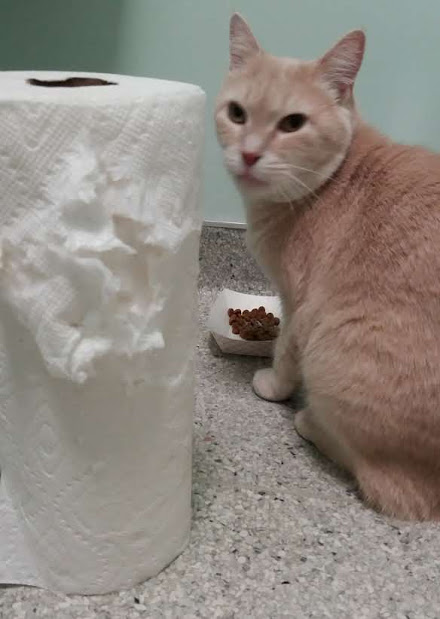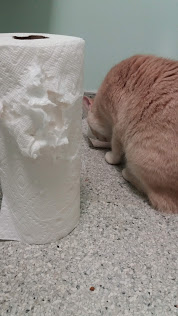 The other day, Creampuff had a bone to pick with a roll of papertowels.