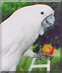 Dearest Roxanna, what a stunning Umbrella Cockatoo you are! Those white feathers are so pretty, and you have such a sweet face with those lovely dark eyes and what looks like a big smile. And what a story you have to tell! You were an impulse purchase for your dear Mom. Your new parents had a lot to learn about caring for you, but it has been well worth it for them and you both, hasn't it. You live with them and Abby the poodle and Gypsy the kitty. You're a constant joy to them, if an occasional pest.. a true "love sponge." You help them with running their cherry orchard and sitting on the deck watching the hummingbirds. I'd love to see you go into that attack display when one gets too close! You and your dear parents love each other very much, don't you. What a wonderful love-filled home you share!