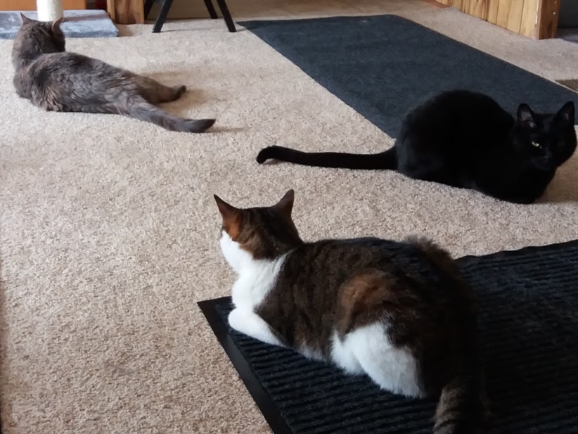 The kitties are all tuckered out, but once the sun goes down and it's close to dinnertime, they seem to forget about the heat.