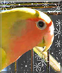 Dearest Foof, what a beautiful Peachfaced Lovebird you are, with those gorgeous feathers and that sweet face with the lovely big eyes and what looks like a big grin! You are the beloved pet of your dear special person and mother to many gorgeous lovebird chicks, two of whom are still with you! You are quite conversational, saying "Hi" and wolf whistling back and forth all day. You and your dear person love each other very much, don't you. What a wonderful love-filled home you share!