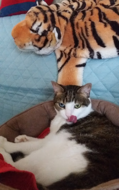 Olive found a new protector: flat tiger on the back of the futon: