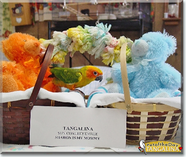 What a gorgeous Sun Conure you are, Tangalina! Your brilliant coloring is breathtaking, and your personality just as bright and sunny as your plumage!