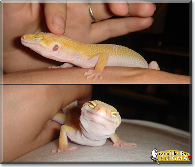 Thanks for the BIG smiles, Enigma! Meeting you today, seeing your heart-melting photos, has been a joy! I hope you're enjoying a very special day of celebration, being loved and pampered to pieces, treated to all your heart desires and more! Lots of love and gentle pets to you, beautiful Enigma, our very special and most deserving Pet of the Day, EVERY day! Love to all of your Gecko/lizard buddies, too!:love::love::love: