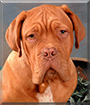 Oh my gosh, just look at that face! I'm in love!!!! What a beautiful Dogue de Bordeaux you are, Arnold, with that gorgeous red-brown fur and that sweet face with those lovely eyes that match your fur. You look sad, but you are really a very happy puppy! You love to sleep in your parents' bed, pushing them out. You also enjoy eating your human sisters' socks, playing in the park, watching football, and, especially, slobbering all over your dear people. You are only five months old but already the size of a small pony! You and they all love each other very much, don't you. What a wonderful love-filled home you share!