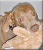 Oh my goodness, Will, how beautiful you are, and what a sweet face you have. I'm in love already! You have that gorgeous smooth brown coat and the sweetest face with that cute brown nose and those lovely big golden eyes looking right at me with so much love. You're absolutely adorable holding that stuffie! You have the most delightful personality, too, making your dear people smile with your antics and energy. It's inconceivable to me that you were given up from three earlier homes, but you've hit the jackpot with this one. Now you are home and safe for the rest of your life, living the terrific life you deserve and have deserved all along. You and your dear people all love each other very much, don't you. What a wonderful love-filled home you share!