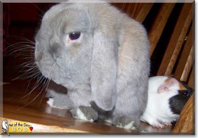 Dearest Bob, you are adorable! What a beautiful Holland Lop Rabbit you are, and how cute to see your dear little guinea pig pal tucked behind you there! You also have a cat housemate, with whom you've become best of friends, too. How interesting (if that's the right word), your enjoyment of "bobbing for apples!" You love to kiss people, love attention, and are the world's greatest bunny snuggler. You and your dear people and piggie and kitty all love each other very much, don't you. What a wonderful love-filled home you share!