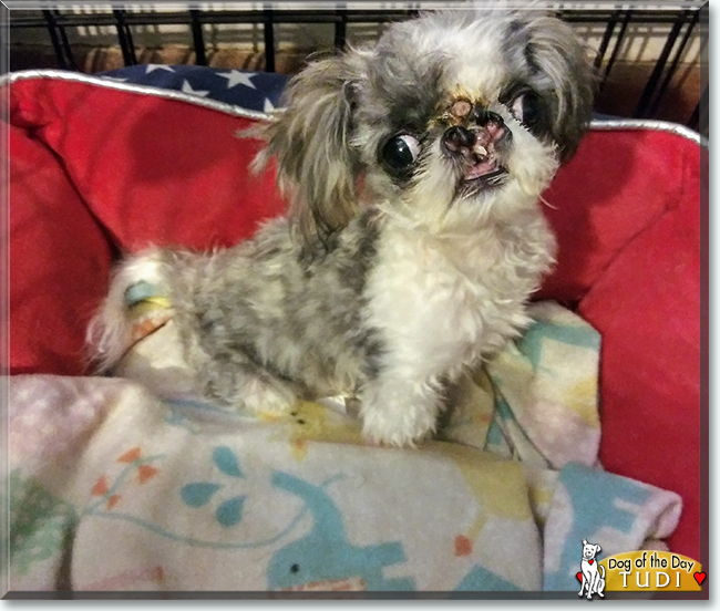 Dearest Tudi, what a beautiful, precious young Shih Tzu you are! And what a fighter you are, too! You're a miracle puppy, contending with many difficult conditions but you don't let those slow you down. You love to bark, ride in your stroller, and meet new people and animals. You're also very sassy, and you demand attention at all times! You love attacking hands and climbing on your dog boss and adopted dog siblings. You and they and your dear Purrrsons all love each other very much, don't you. What a wonderful love-filled home you share!