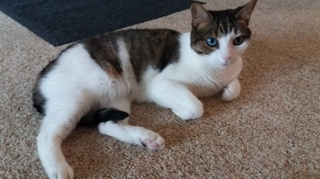 Then, a Domestic Shorthair, Olive; some classic tabby coloring with white, has heterochromia, meaning two different colored eyes.