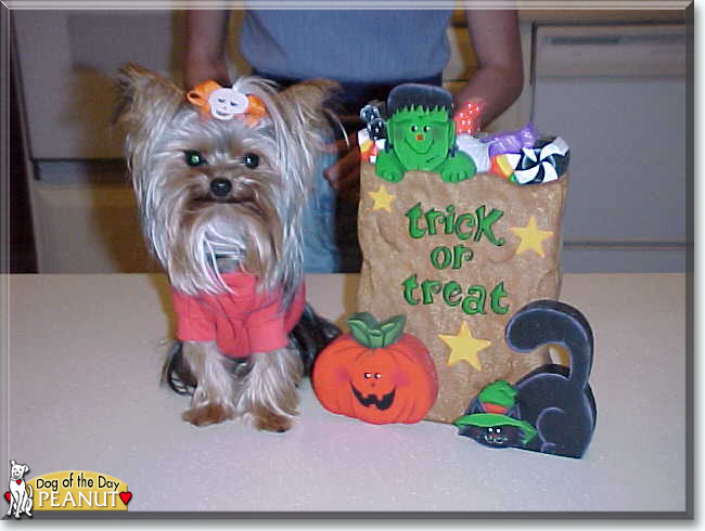 Dearest Peanut, you are adorable! What a sweet, precious Yorkshire Terrier you are. You're so cute, all dressed up for last Halloween! (I bet you'll come up with a terrific outfit for this year, too.;)) You and your dear people and dear cousin Freckles all love each other very much, don't you. What a wonderful love-filled home you share!