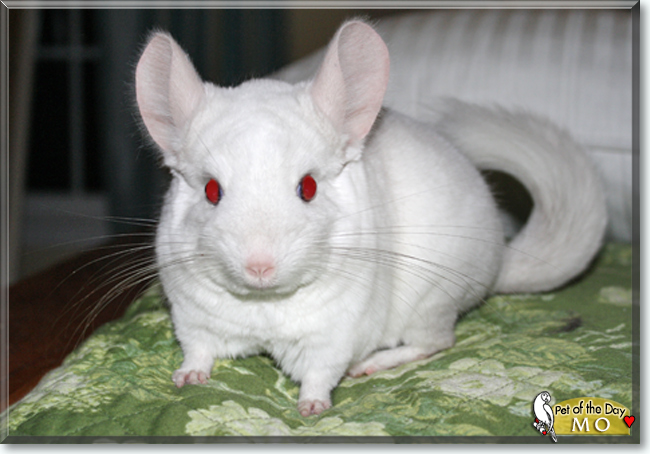 Dearest Mo, you are utterly adorable! What a sweet little Pink-eyed white chinchilla you are! You're so cute with that soft-looking white fur and those huge ears and those big pink eyes looking straight out at me! And what a delightful personality you have! You live by yourself, but you and your dear person spend lots of time together, which you both treasure. You don't bite, and you love chin scratches! His/her favorite number has always been three, and you're the third chinchilla she/he has gotten to have. You both love each other very much, don't you. What a wonderful love-filled home you share!