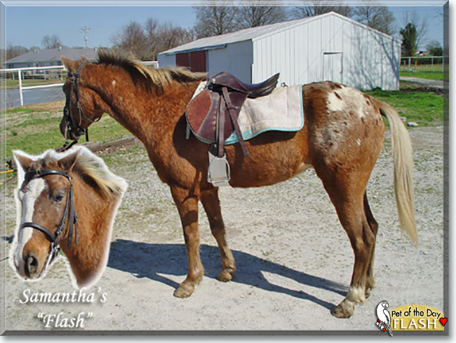 Dearest Flash, what a beautiful Pony of the Americas you are! Your coloring is gorgeous, and how interesting that it changes with the seasons! You have the most delightful personality, too. You're short, but you can jump four to five feet high! You couldn't do much when you first came to your dear person, but you're very smart and have been learning quickly since you started your training. You're very sweet, too, and you and your dear person love each other very much, don't you. He/she says you prove that great things can come in small packages. What a wonderful love-filled home you share!