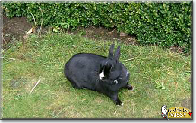 What a beautiful, ebony Netherland x Dutch Dwarf bunny you are, Missy, though I'm half tempted to call you 1/2 human!:D;) But one thing is for sure: you are truly a full-fledged family member!