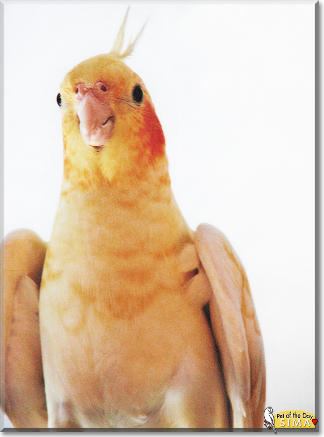 Dearest Sima, you are gorgeous! What a beautiful Cockatiel you are, with those colorful feathers and that sweet face with the lovely big eyes. And what a wonderful story you have to tell! You've lived with your dear family for your entire life so far. They take very good care of you, and you like being around them. When someone is watching TV, you fly onto that person's shoulder and settle there to watch with them! You enjoy flying around the room, and we say thank you and bless you to your dear people for making sure doors and windows are shut before they let you out. You did many tricks when you were younger and before you got your dear parrot boyfriend. You and he and your people all love each other very much, don't you. What a wonderful love-filled home you share!