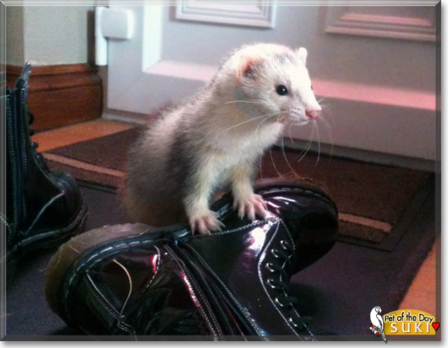 What a beautiful, most precious, sweet as can be Ferret girl you are, Suki! Thanks so much for posing so patiently for the camera, so all the world can see just how adorable you are! I can just imagine how heads turn as you stroll past the school with your human, sweetheart, winning the hearts of all the young ones and passersby; well, most of them!;) And what a silly girl, digging a hole in the grass, diving in head first, popping up with a dirty face and paws!:D What a character! Your human is one lucky soul, having a furkid as energetic and playful, as sweet and loving, as beautiful as you, Suki! You're a treasure, just as special as can be, simply the best!