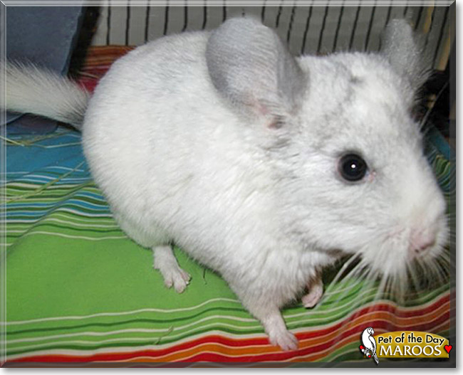 Dearest Maroos, what a beautiful young Lilac Chinchilla you are, with such pretty white fur and such a sweet face with those lovely big dark eyes! And what a heartbreaking but ultimately uplifting story you have to tell! Your dear person got you from a pet store, and you turned out to have fatty liver disease and other genetic problems. You lived only five months and never grew. We're so sorry you only had such a short time together, but at least you and your person had those few months full of love and warmth and good care. My deepest sympathy to him/her, and may those many precious memories and keepsakes help to bring comfort.