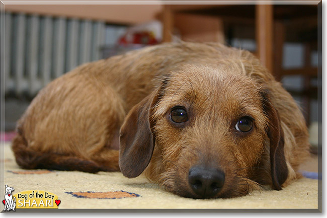 Aww!!! What a beautiful, Wire Haired Doxi girl you are, Shaari! I just love your wiry coat and golden coloring; so pretty!The calendar may say you're 9 years young but honestly, you don't look much older than 2! And oh yes! Those big, soulful brown eyes of yours, that pleading expression could melt the coldest of hearts! Your secret weapon!:D