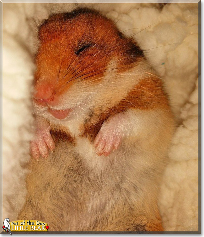 Dearest Little Bear, you are lovable indeed! What a precious little Syrian Hamster you are, so pretty with that colorful fur and sweet face. Thank you for sharing those great photos with us! How tiny you are in your dear person's hand, and how cute you are lying on your back with your tummy up and that look on your face as though you are smiling (and you probably are!). You and your person love each other very much, don't you. You provide great support as he/she contends with poor health. What a wonderful love-filled home you share!