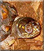Dearest Speedette, what a beautiful Eastern Box Turtle you are, and what a great habitat you have, with bedding you blend right in with. And what a nice story you have to tell! Your dear people rescued you when you were tiny, smaller than a quarter. You've lived with them ever since, some seventeen years now. You have the most delightful personality. You react to your family's different voices differently, and you're not bothered by the cat or dog or the noises they make. You're quite calm, and nothing bothers you enough to make you retreat into your shell. You're a very special member of your family, and you all love each other very much, don't you. What a wonderful love-filled home you share!