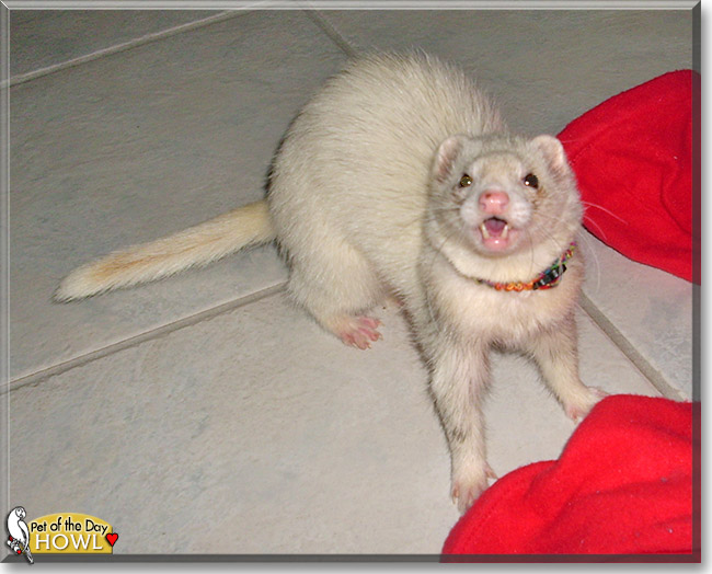 Dearest Howl, what a beautiful ferret you are! I love both those great pictures, and thanks for sharing them with us. What an amazing story you have to tell. You somehow wound up in your person-to-be's backyard, and very fortunately she discovered you! You wouldn't have lasted long outdoors like that. She decided to keep you, and now you are living the life you deserve (and deserved all along!), full of loads of love and warmth and good food. You love each other very much, don't you. What a wonderful love-filled home you share!