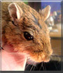 Dearest Eddie, you are precious indeed! What an adorable little Mongolian Gerbil you are, with that soft-looking, pretty brown fur and that sweet face with the perky little ears and those lovely big dark eyes. And what a delightful personality you have! You are four years old, a nice ripe age for a gerbil, and you live happily in your cage, playing with your blue chew toy, curled up napping, or standing guard on your little hut. You were adopted along with your cage-mate Crash, and I'm sorry to learn he passed away last year and you've been alone ever since.