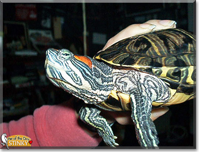 Dearest Stinky, what a beautiful guy you are with all those gorgeous colors! You're a funny guy, too, with your own distinct personality. You enjoy being picked up, and you prefer eating bologna over your regular turtle food. You're your dear person's first pet, and you both love each other very much, don't you. What a wonderful love-filled home you share!