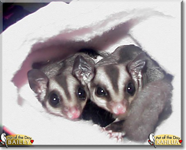 Bailey and Kahlua are beautiful Sugar Gliders. Their Mom loves them very much and take good care of them.