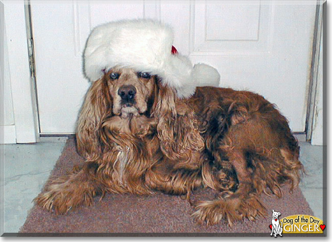 Dearest Ginger, what a beautiful Cocker Spaniel you are! That long colorful fur is absolutely gorgeous, and you have the sweetest face with those long, LOOOONG ears and the lovely big dark eyes. You're so cute in your Santa hat.