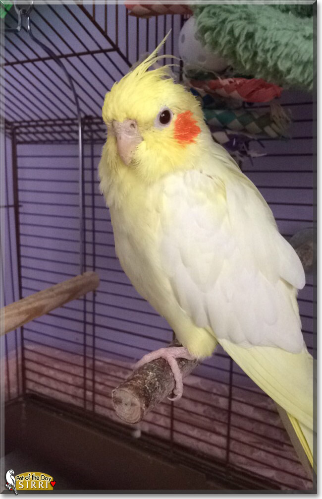 Dearest Sirri, you are absolutely stunning! You're such a beautiful Cockatiel with those colorful feathers and that sweet face with the lovely big dark eyes and what looks like it might be a smile (and probably is!). You're super-special, according to your dear mom. You're a rescue who didn't let anyone touch you until you met her. Right away you knew she was your mom! You're her family, and you've been with her through everything, even cuddling her to comfort her when she's sad. You and she love each other very much, don't you. What a wonderful love-filled home you share!