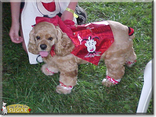Dearest Sugar, you are adorable! What a sweet young lady you are, dressed up in your Joker costume! That American Cocker Spaniel fur is so pretty and looks so soft, and you have the sweetest face with those lovely big dark eyes. You have quite the delightful personality, too; you're an active couch potato! You and your purebred-mutt housemate Cindy enjoy taking your dear person for walks as often as possible. You also enjoy eating, sleeping, eating, sniffing, and playing. You and your family members all love each other very much, don't you. What a wonderful love-filled home you share!