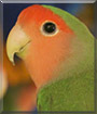 Dearest Rocky, what a beautiful Peachfaced Lovebird you are! You're so pretty with those colorful feathers and that sweet face with those lovely dark eyes and that look as though you are smiling (and very likely you are!). You have the most delightful personality, too! You're very loving and playful. You love snuggles and cuddles and having your head and back kissed. How nice that you fly free most of the time and sometimes even land on heads! We thank your dear people for keeping you safe, making sure windows and doors are always shut before you get let out of your cage. You are one of your person's special boys and of course an important member of the flock. You all love each other very much, don't you. What a wonderful love-filled home you share!