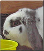 Dearest Oreo, what a precious Mini Lop Rabbit you are! You are so pretty with that soft-looking white fur with black spots, and that sweet face with the cute grey ears and those lovely dark eyes. And what a delightful personality you have! You enjoy sitting in your hutch, looking out at the scenery. You're very affectionate and love to be petted and have the top of your head rubbed. You stay as close to your dear people as you can, and you even come over to snuggle when someone sits or lies on the grass! You're very fussy about your food, eating it in "like" order. Sometimes you even dump the least-liked dish to let your people know you've had enough of the slop and want some treats! You and they all love each other very much, don't you. What a wonderful love-filled home you share!