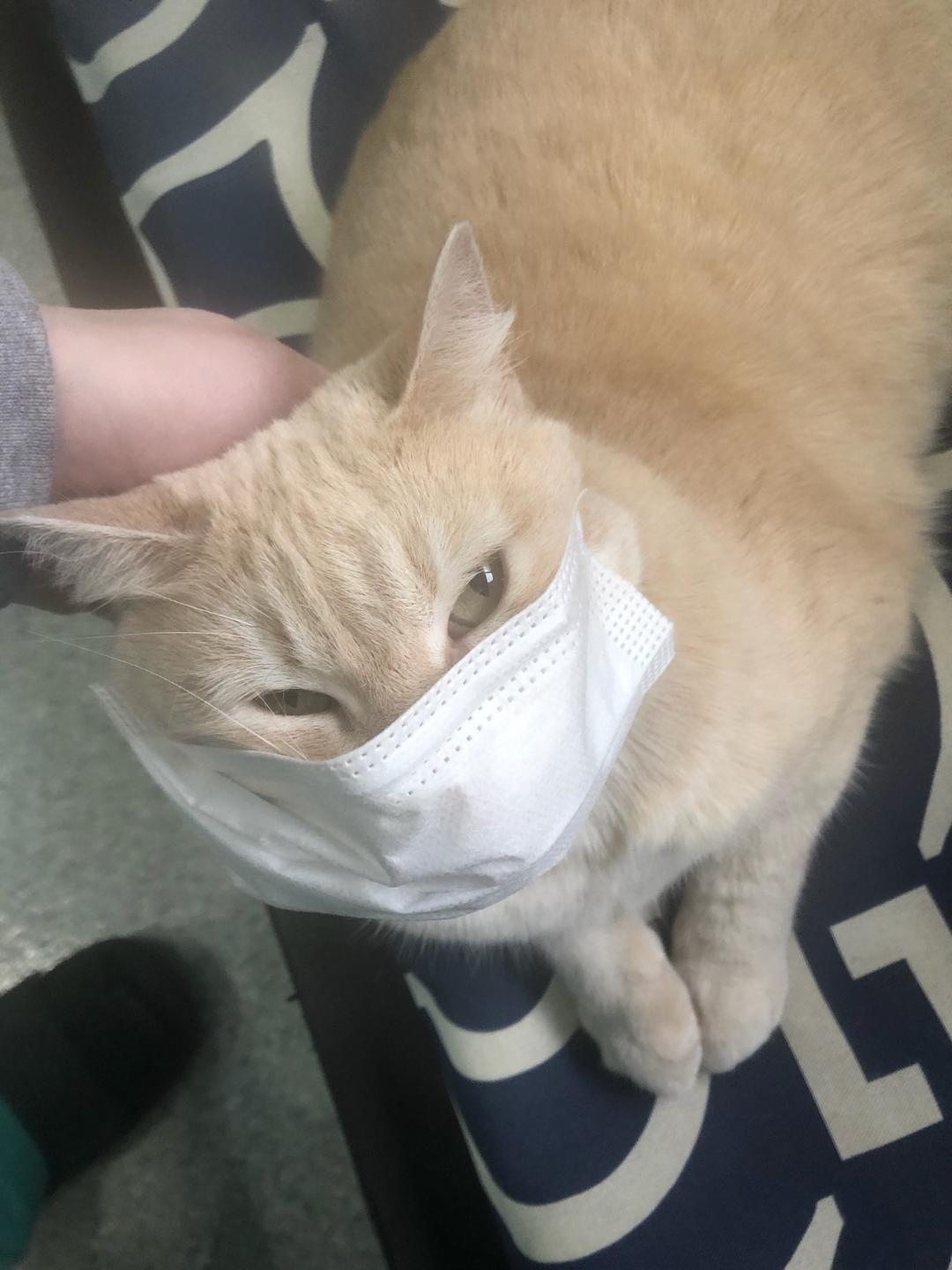 As a responsible hospital cat, Creampuff is wearing a mask like all her co-workers. I think it lasted about 20-30 seconds :D, and the resentment in her eyes is uncanny.