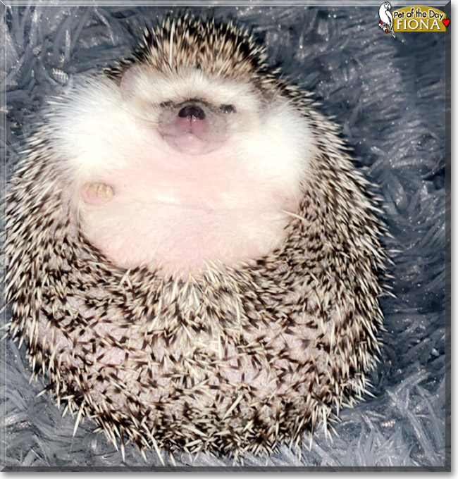 Dearest Fiona, what an adorable, precious little African Pygmy Hedgehog you are! You're so pretty with that spiky colorful coat and that sweet face with the lovely big dark eyes and the look as though you are smiling (and you probably are!). You are a little sweetie who loves blankets and loves to snuggle in them and get very cuddly cozy there. You're supposed to eat worms, but you're afraid of them! Fortunately, you get your protein from other sources. You are your dear person's cutest baby ever, and you two love each other very much, don't you. What a wonderful love-filled home you share!