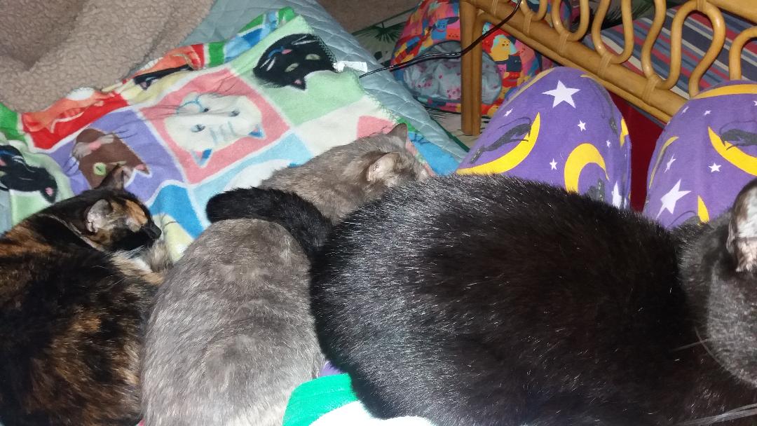 As the cats ignore all people rules, Clover uses Miss Kitty as his tail rest.